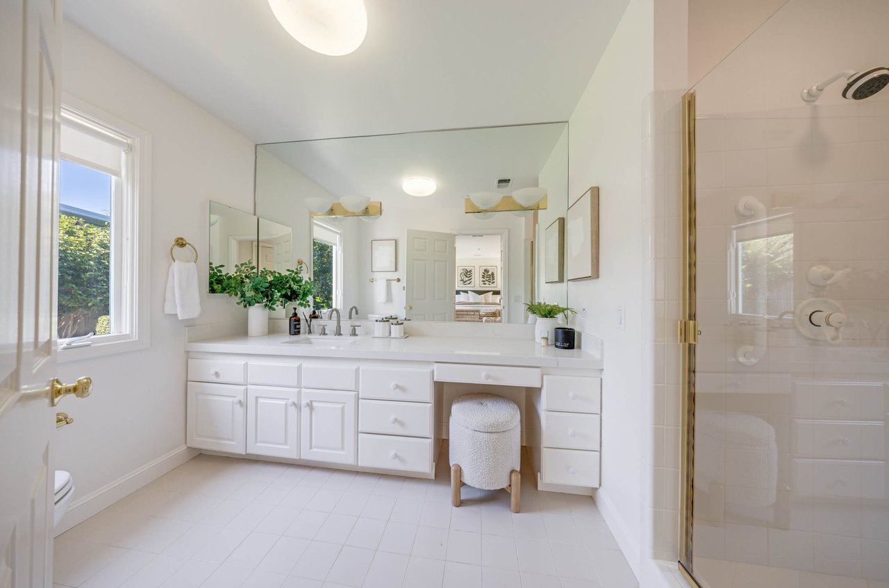 The light and bright primary suite includes two walk-in closets with custom wardrobe systems and access to the inviting backyard; the primary bathroom features tile flooring, a new quartz countertop and sink, and a stall shower.