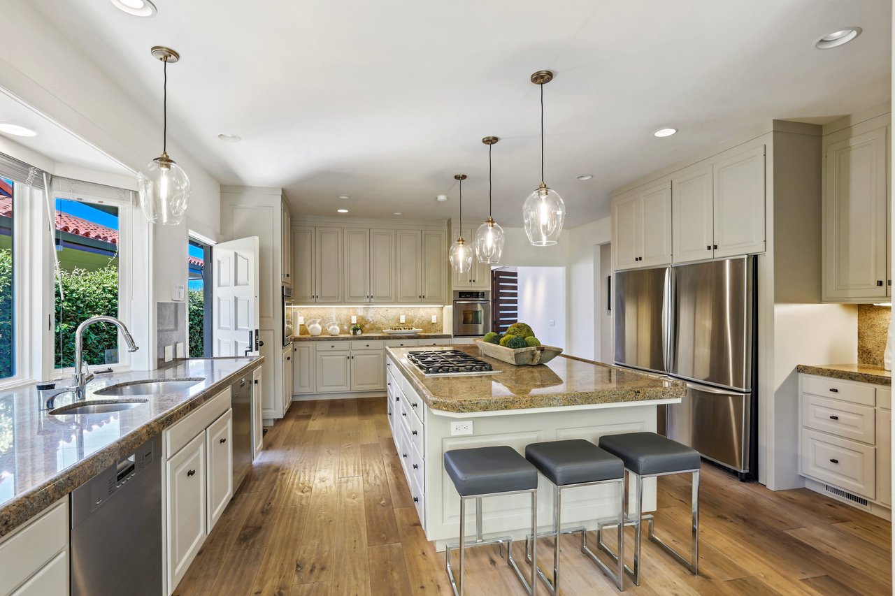 Chef inspired kitchen featuring granite countertops, a large center island with counter seating, custom cabinetry, and stainless steel appliances: (2) Kenmore refrigerators, (2) Miele dishwashers, (2) Kitchenaide ovens, and a Dacor gas range; and an adjacent inviting casual dining area.